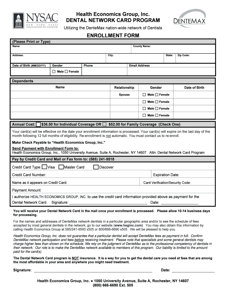 Health Economics Group, Inc. DENTAL NETWORK CARD PROGRAM Utilizing the Dental nation-wide network of Dentists ENROLLMENT FORM (Please Print or Type) Name: County Name: Address: City: Date of Birth