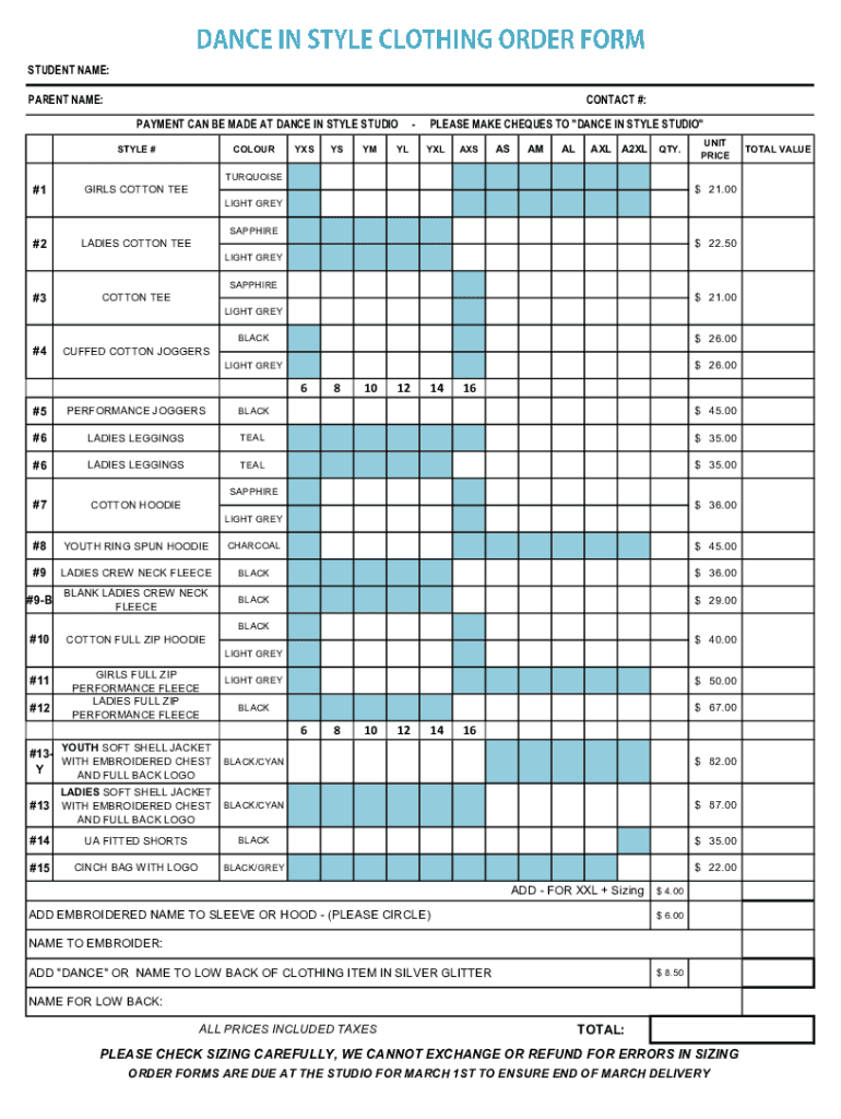 STUDENT NAME: CONTACT #:PARENT NAME: PAYMENT CAN BE MADE AT DANCE IN STYLE STUDIO STYLE #COLOURYXSYSYMYLPLEASE MAKE Checks TO “DANCE IN STYLE STUDIO YXLAXSASAMALAXL A2XLQTY.UNIT PRICETURQUOISE#1GIRLS