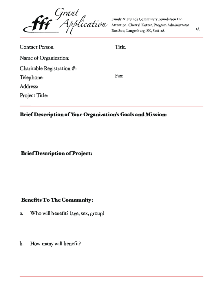 Grant!licationContact Person:Family & Friends Community Foundation Inc.# Attention: Cherry Other, Program Administrator Box 800, Brandenburg, SK, S0A 2ATitle:Name of Organization: Charitable Registration