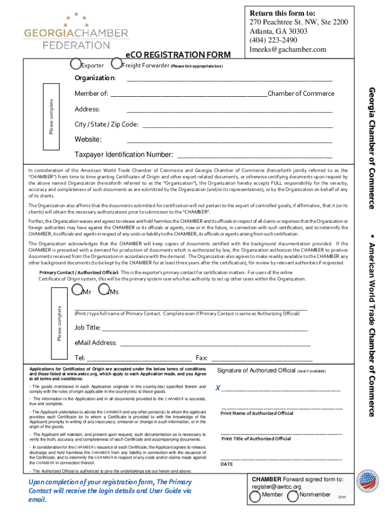 ECO REGISTRATION FORM ExporterReturn this form to: 270 Peach tree St. NW, Ste 2200 Atlanta, GA 30303 (404) 2232490 leeks chamber. Freight Forwarder (Please tick appropriate box)Organization: Please