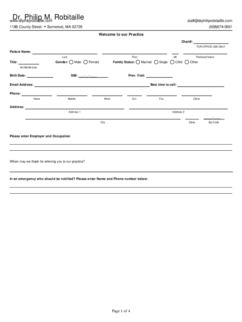 Dr. Philip M. Robitaillewww.drphiliprobitaille.com 1188 County Street staff drphiliprobitaille. Somerset, MA 02726(508)6740551 Welcome to our Practice Chart#: FOR OFFICE USE Outpatient Name: Lattice:Cisgender:MaleFemaleFamily