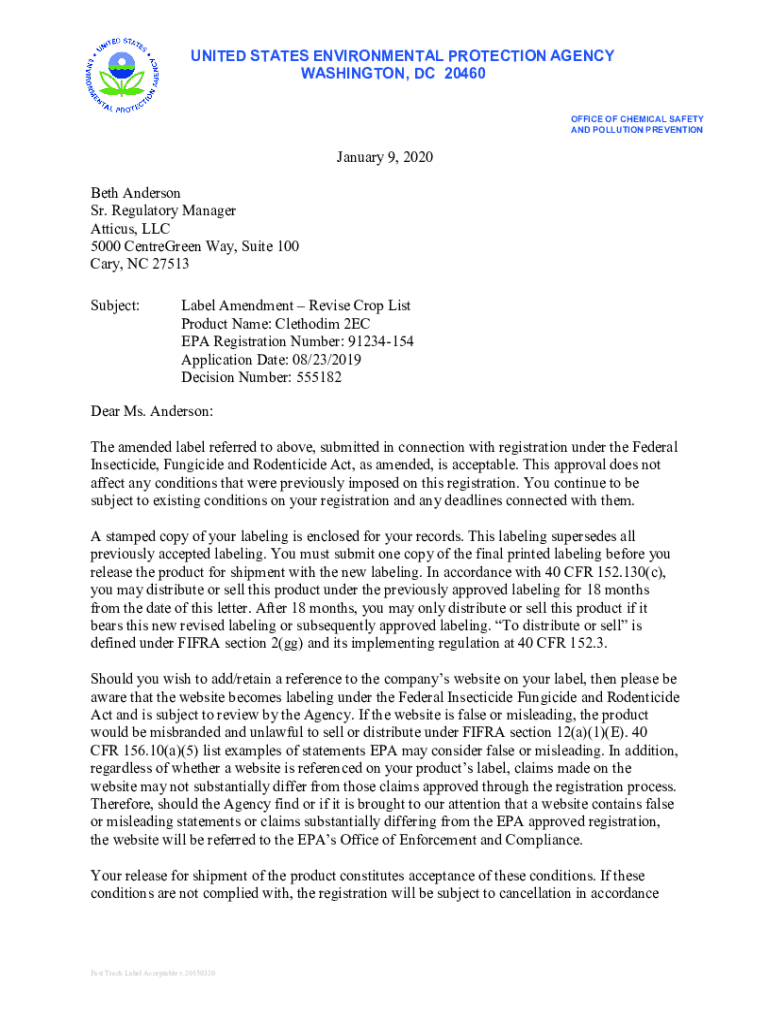 UNITED STATES ENVIRONMENTAL PROTECTION AGENCY WASHINGTON, DC 20460 OFFICE OF CHEMICAL SAFETY AND POLLUTION PREVENTION January 9, 2020, Beth Anderson Sr. Regulatory Manager Atticus, LLC 5000 Wintergreen