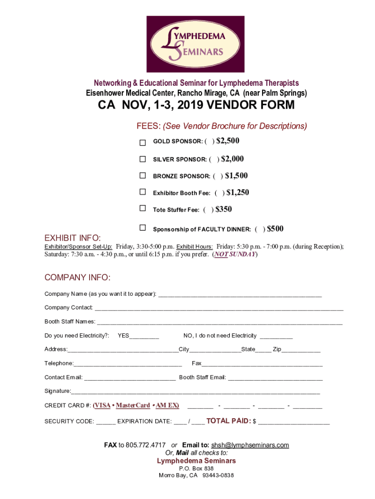 Networking & Educational Seminar for Lymphedema Therapists Eisenhower Medical Center, Rancho Mirage, CA (near Palm Springs)CA NOV, 13, 2019 VENDOR FORMLESS: (See Vendor Brochure for Descriptions)