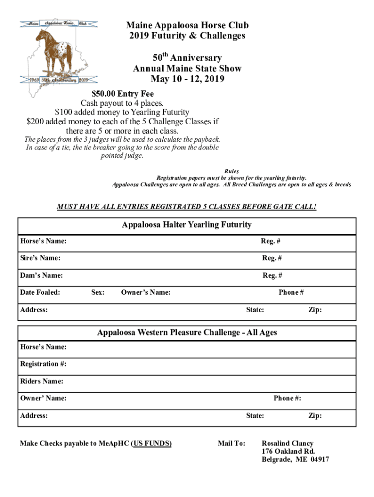 Maine Appaloosa Horse Club 2019 Futurity & Challenges 50th Anniversary Annual Maine State Show May 10 12, $201950.00 Entry Fee Cash payout to 4 places. $100 added money to Yearling Futurity $200 added