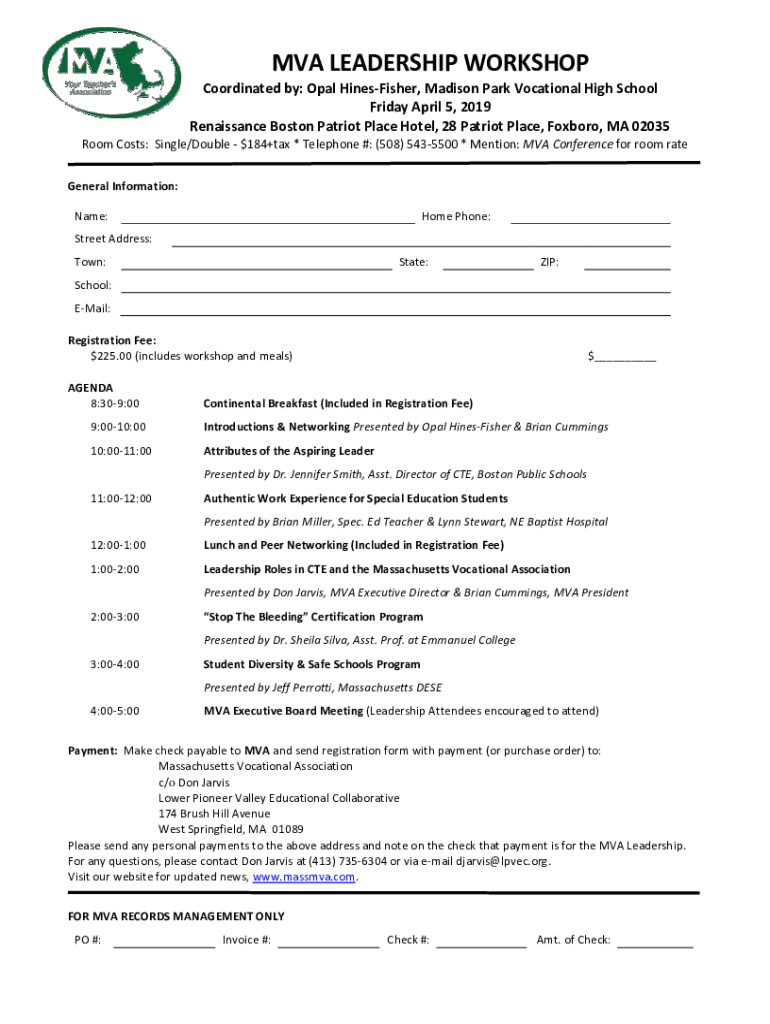 MVA LEADERSHIP WORKSHOP Coordinated by: Opal Hines Fisher, Madison Park Vocational High School Friday, April 5, 2019, Renaissance Boston Patriot Place Hotel, 28 Patriot Place, Forbore, MA 02035 Room