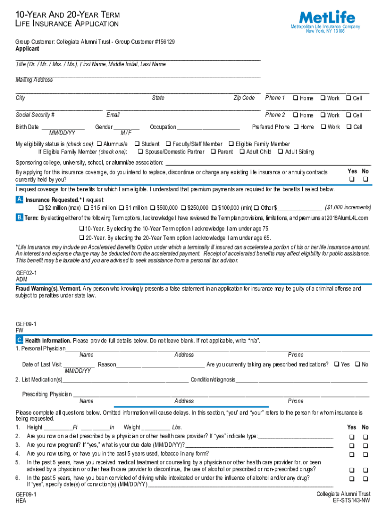 10Year And 20Year Term Life Insurance ApplicationMetropolitan Life Insurance Company New York, NY 10166Group Customer: Collegiate Alumni Trust Group Customer #156129 Applicant Title (Dr. / Mr. / Mrs.