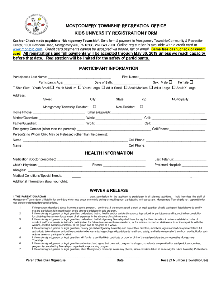 MONTGOMERY TOWNSHIP RECREATION OFFICE KIDS UNIVERSITY REGISTRATION FORM Cash or Check made payable to Montgomery Township. Send form & payment to Montgomery Township Community & Recreation Center,
