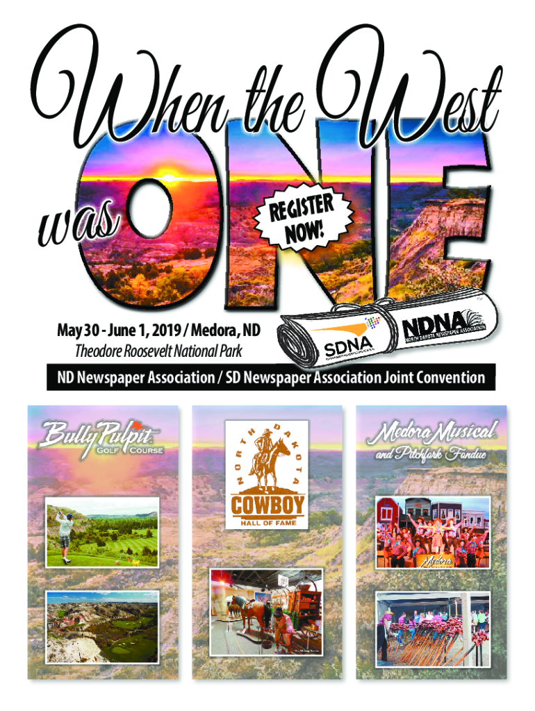 When h the West register NOW! May 30 June 1, 2019 / Fedora, ND Theodore Roosevelt National Park ND Newspaper Association / SD Newspaper paper Association Joint Convention Con mentioned Pitchfork Fondue