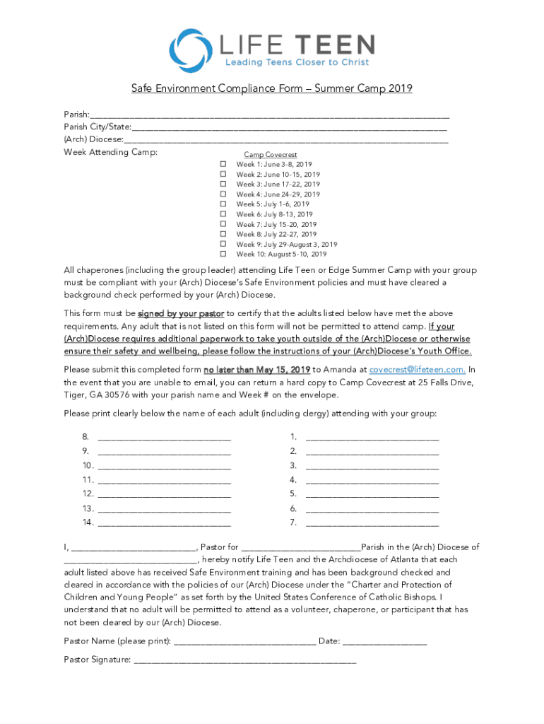 Safe Environment Compliance Form Summer Camp 2019 Parish: Parish City/State: (Arch) Diocese: Week Attending Camp: Camp Cove crest Week 1: June 38, 2019, Week 2: June 1015, 2019 Week 3: June 1722,