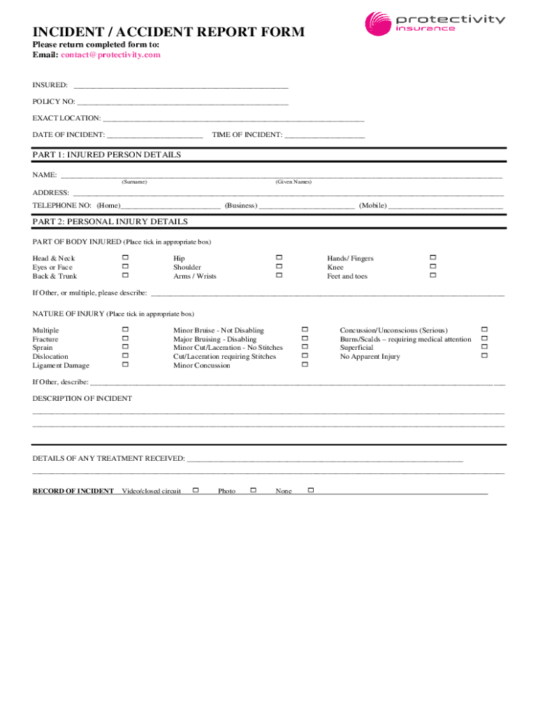 INCIDENT / ACCIDENT REPORT FORM Please return completed form to: Email: contact productivity.consumed: POLICY NO: EXACT LOCATION: DATE OF INCIDENT: TIME OF INCIDENT: PART 1: INJURED PERSON DETAILS