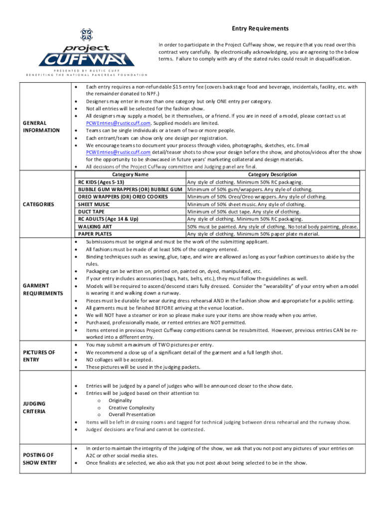 Entry&Requirements& & In#order#to#participate#in#the#Project#Cuff way#show, #we#require#that#you#read#over#this# contract#very#carefully.##By#electronically#acknowledging, #you#are#agreeing#to#the#below#