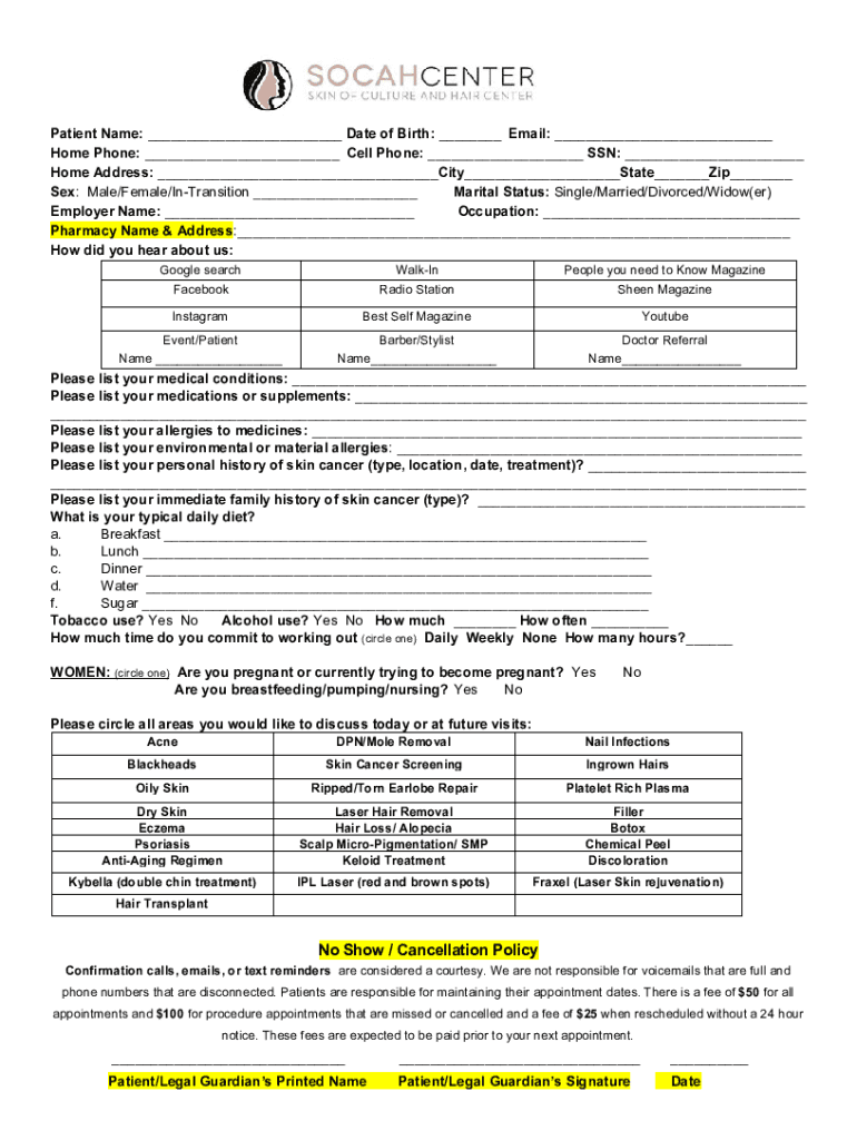 Patient Name: Date of Birth: Email: Home Phone: Cell Phone: SSN: Home Address: City State Zip Sex: Male/Female/Transition Marital Status: Single/Married/Divorced/Widow(er) Employer Name: Occupation: