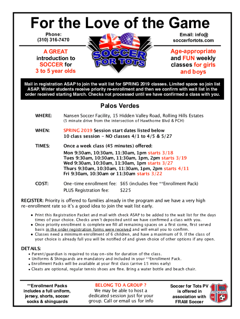 For the Love of the Game Phone: (310) 3167470Email: info soccerfortots.comAgeappropriate and FUN weekly classes for girls and boys GREAT introduction to SOCCER for 3 to 5 year Ismail in registration