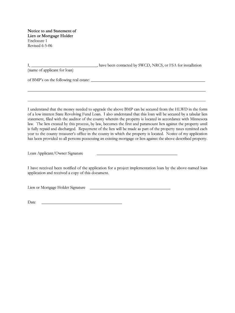 Notice to and Statement of Lien or Mortgage Holder Enclosure 1 Revised 6506 I, have been contacted by SACD, ARCS, or FSA for installation (name of applicant for loan) of BMP son the following real