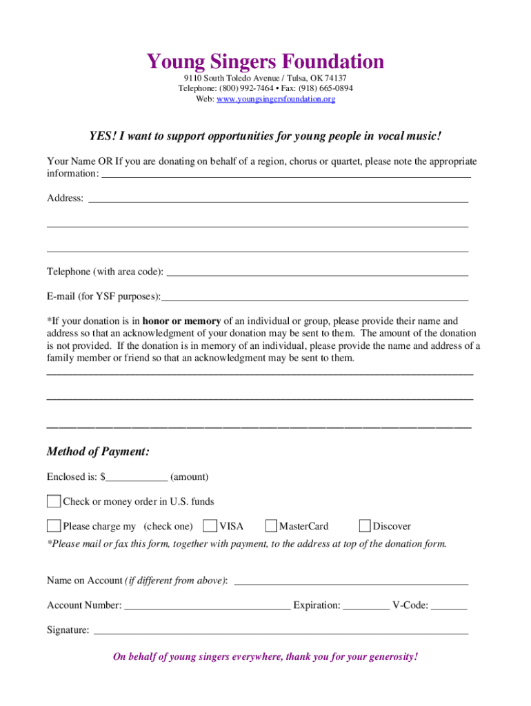 Young Singers Foundation 9110 South Toledo Avenue / Tulsa, OK 74137 Telephone: (800) 9927464 Fax: (918) 6650894 Web: www.youngsingersfoundation.orgYES! I want to support opportunities for young people
