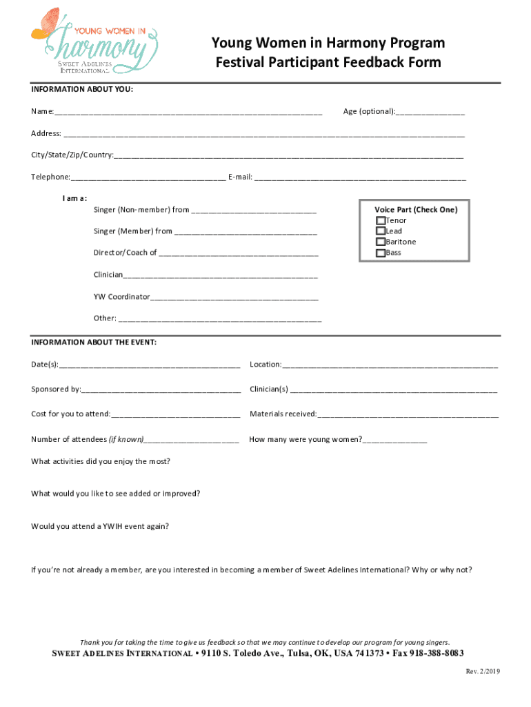 The youngampampampwomeninharmonyprogramampampampampampamp festivalparticipantfeedbackform is a document designed to collect feedback from participants of the Young Women in Harmony Program festival, allowing organizers to assess the event's effectiveness and areas for improvement.