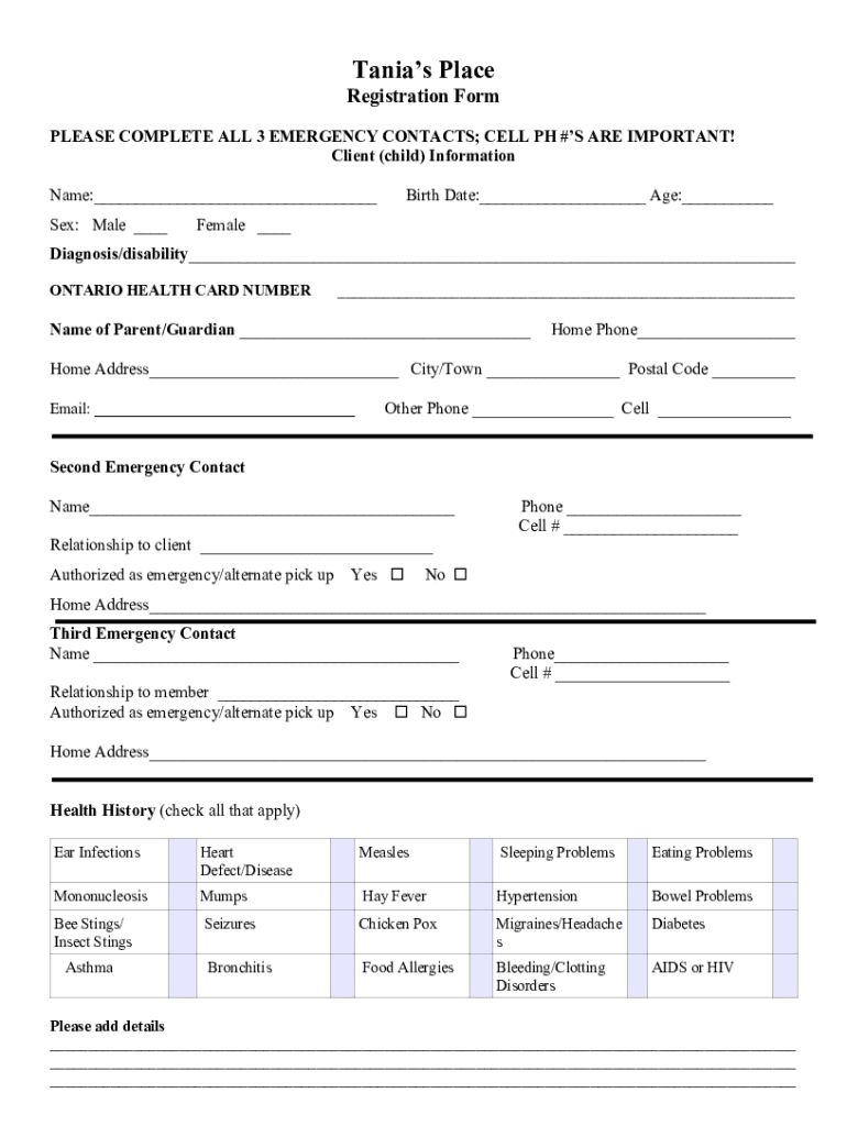 Tania's Place Registration Form PLEASE COMPLETE ALL 3 EMERGENCY CONTACTS; CELL PH #S ARE IMPORTANT! Client (child) Information Name: Sex: Male Birth Date: Age: Female Diagnosis/disability ONTARIO