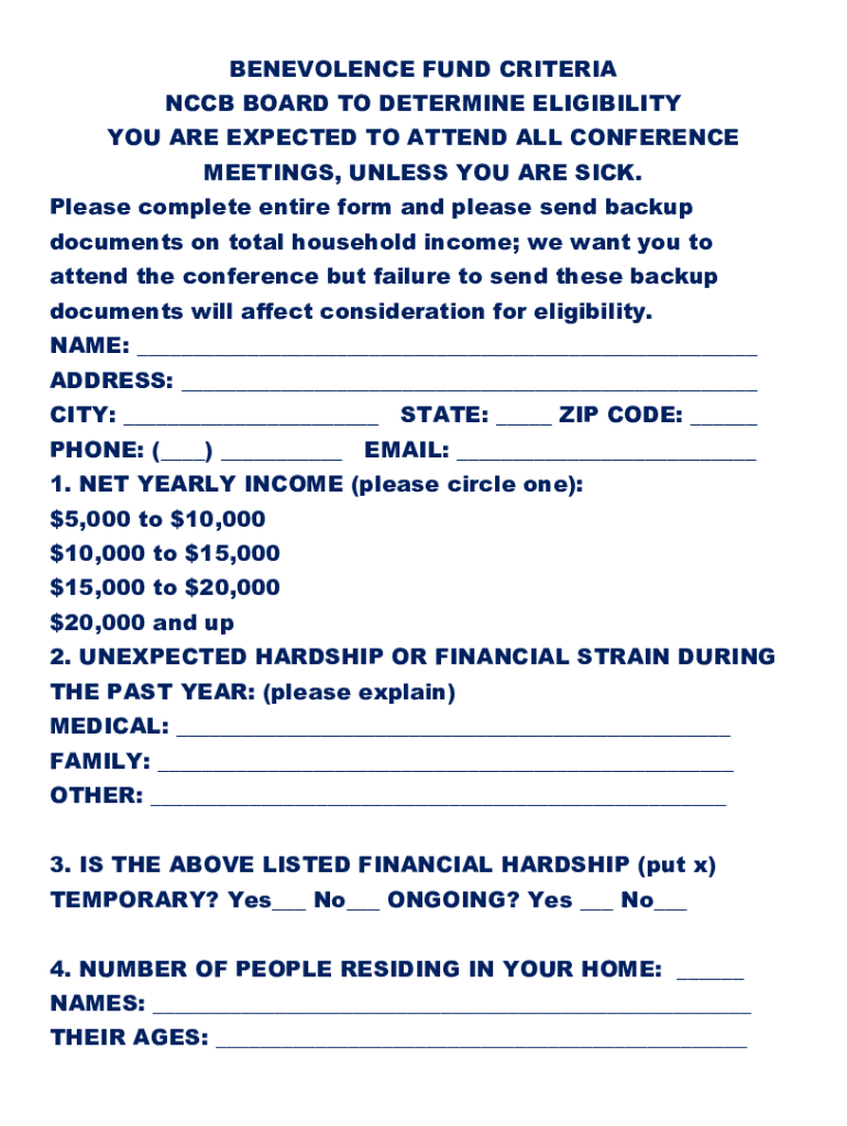 BENEVOLENCE FUND CRITERIA CCB BOARD TO DETERMINE ELIGIBILITY YOU ARE EXPECTED TO ATTEND ALL CONFERENCE MEETINGS, UNLESS YOU ARE SICK. Please complete entire form, and please send backup documents
