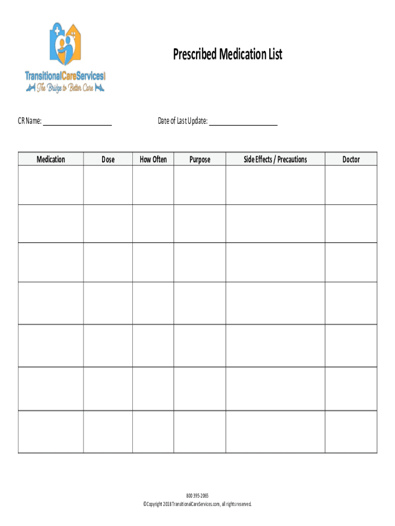 Prescribed Medication Lister Name: MedicationDoseDate of Last Update: How OftenPurposeSide Effects / Precautions800 3952065 Copyright 2018 TransitionalCareServices.com, all rights reserved. DoctorMedicationDoseHow