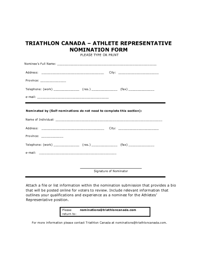 TRIATHLON CANADA ATHLETE REPRESENTATIVE NOMINATION FORM PLEASE TYPE OR PRINT Nominees Full Name: Address: City: Province: Telephone: (work) (res.) (fax) email: Nominated by (Self nominations do not