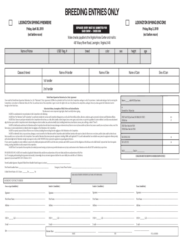 BREEDING ENTRIES ONLY LEXINGTON SPRING PREMIERELEXINGTON SPRING ENCORE SEPARATE ENTRY MUST BE SUBMITTED FOR EACH SHOW CHECK BOX Friday, April 26, 2019 (not before noon)Friday, May 3, 2019 (not before