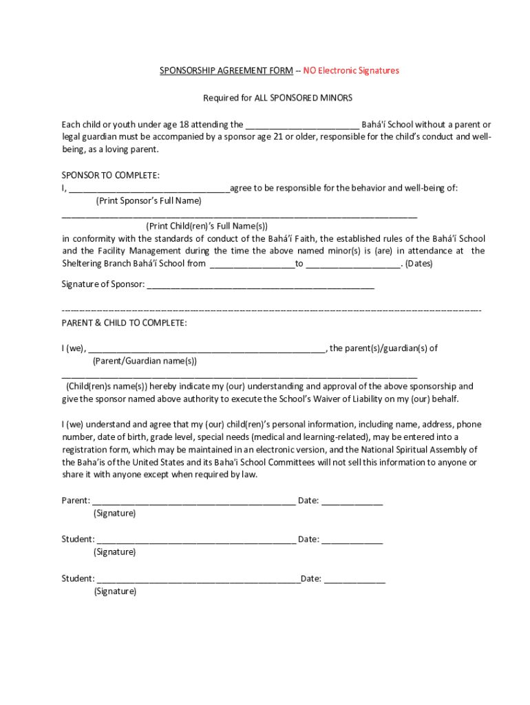 SPONSORSHIP AGREEMENT FORM NO Electronic Signatures Required for ALL SPONSORED MINORS Each child or youth under age 18 attending the Bah School without a parent or legal guardian must be accompanied