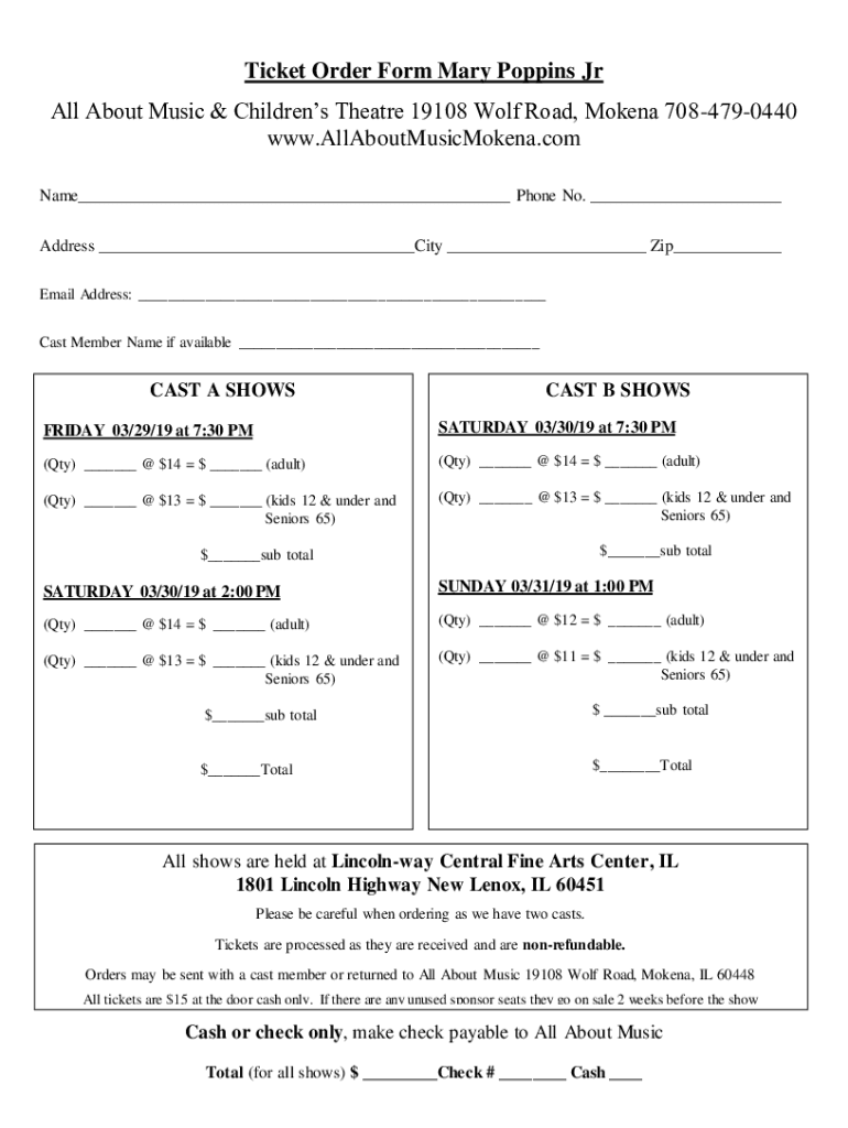 Ticket Order Form Mary Poppins Jr All About Music & Children's Theater 19108 Wolf Road, Modena 7084790440 www.AllAboutMusicMokena.com Name Phone No. Address City Zip Email Address: Cast Member Name