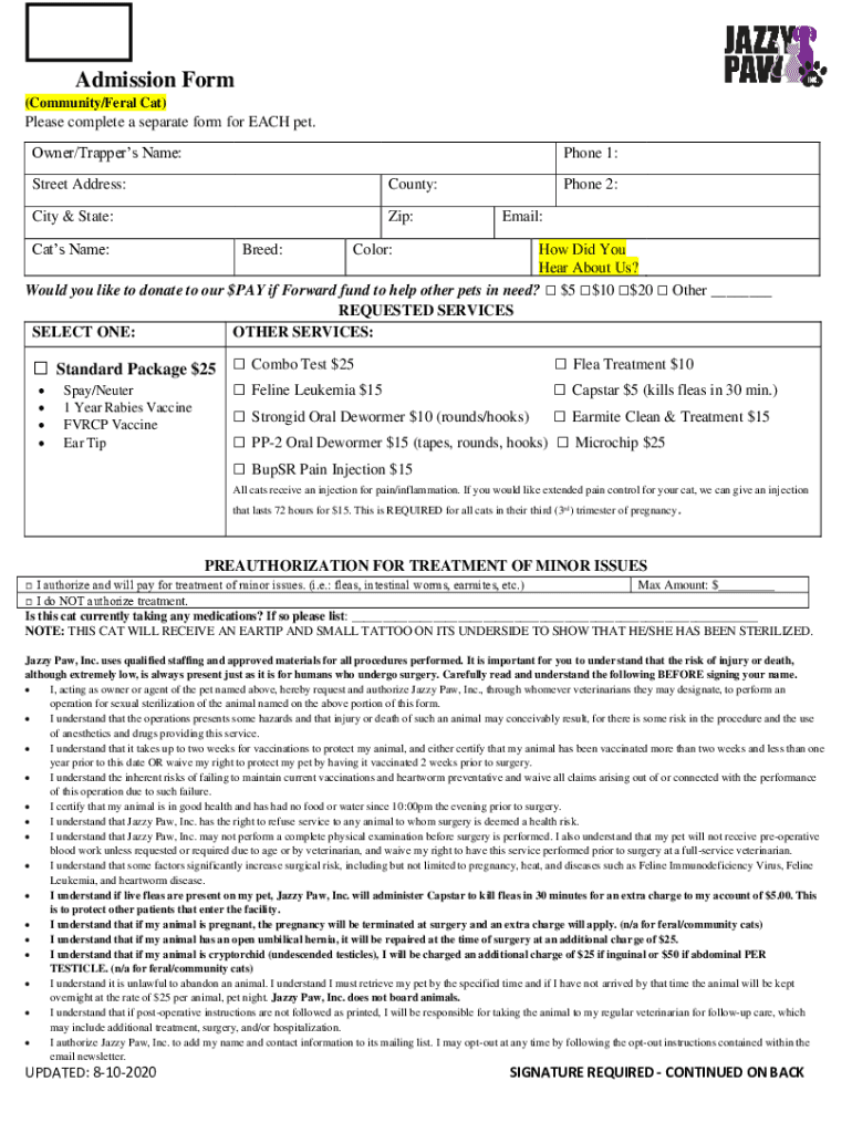 Admission Form (Community/Feral Cat)Please complete a separate form for EACH pet. Owner/Trappers Name:Phone 1:Street Address:County:City & State:Zip:Cats Name:Breed:Phone 2: Email:Color:How Did You