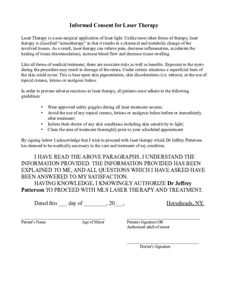 Informed Consent for Laser Therapy is a nonsurgical application of laser light. Unlike most other forms of therapy, laser