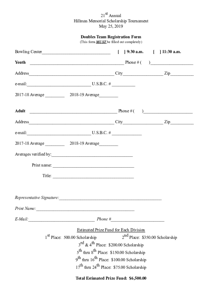 21st Annual Hillman Memorial Scholarship Tournament May 25, 2019, Doubles Team Registration Form (This form MUST be filled out completely)Bowling Center Youth 9:30 a.m. Phone # (11:30 a.m.) Address