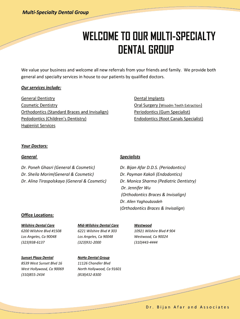 Multi-Specialty Dental Group WELCOME TO OUR MULTI-SPECIALTY DENTAL GROUP We value your business and welcome all new referrals from your friends and family. We provide both general and specialty services