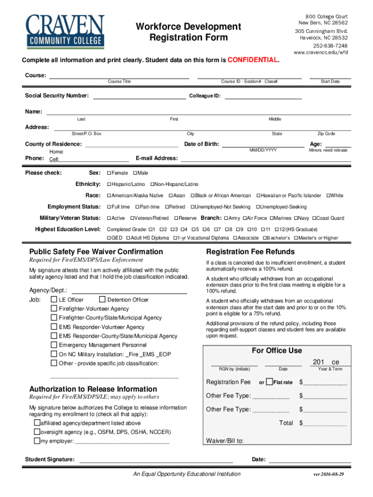 800 College Court New Bern, NC 28562 305 Cunningham Blvd. Havelock, NC 28532 2526387248 www.cravencc.edu/wfdWorkforce Development Registration Form Complete all information and print clearly. Student