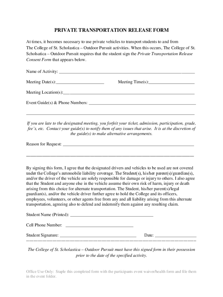 PRIVATE TRANSPORTATION RELEASE FORM At times, it becomes necessary to use private vehicles to transport students to and from The College of St. Scholastic Outdoor Pursuit activities. When this occurs,