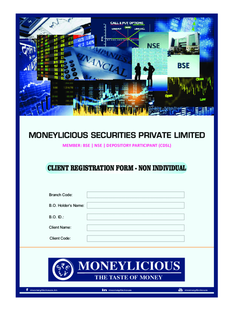 MONEYLICIOUS SECURITIES PRIVATE LIMITED MEMBER: BSE USE DEPOSITORY PARTICIPANT (CDs)CLIENT REGISTRATION FORM NON-INDIVIDUAL Branch Code: B.O. Holders Name: B.O. ID.: Client Name: Client Code:$MONEYLICIOUS
