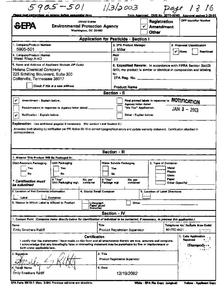 , J............ “. United Stat.&EPAEnvironmental Protection Agency 'Wei. Hinton. DC 20.60n “N. J t /6., I. 2.21195Registration Amendment Other opp Identifier NumberAPDlicatlon for Pesticide Section