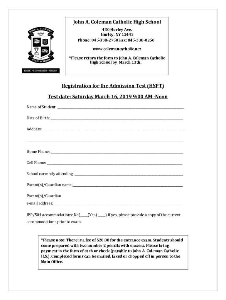 John A. Coleman Catholic High School 430 Hurley Ave. Hurley, NY 12443 Phone: 8453382750 Fax: 8453380250 www.colemancatholic.net *Please return the form to John A. Coleman Catholic High School by March