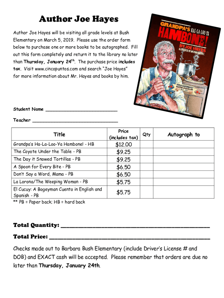 Author Joe Hayes Author Joe Hayes will be visiting all grade levels at Bush Elementary on March 5, 2019. Please use the order form below to purchase one or more books to be autographed. Fill out this