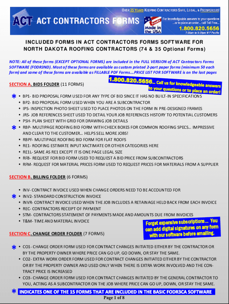 INCLUDED FORMS IN ACT CONTRACTORS FORMS SOFTWARE FOR NORTH DAKOTA ROOFING CONTRACTORS (74 & 35 Optional Forms) NOTE: All of these forms (EXCEPT OPTIONAL FORMS) are included in the FULL VERSION of