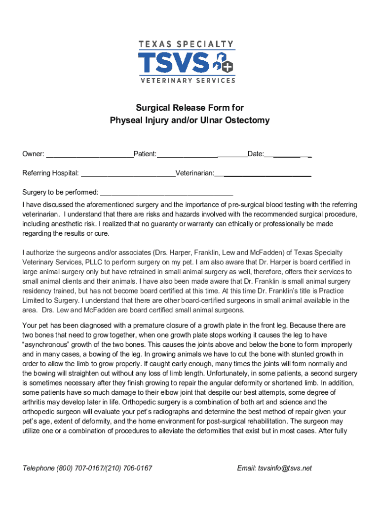 Get the free Surgical Release Form for Physeal Injury and/or Ulnar Ostectomy