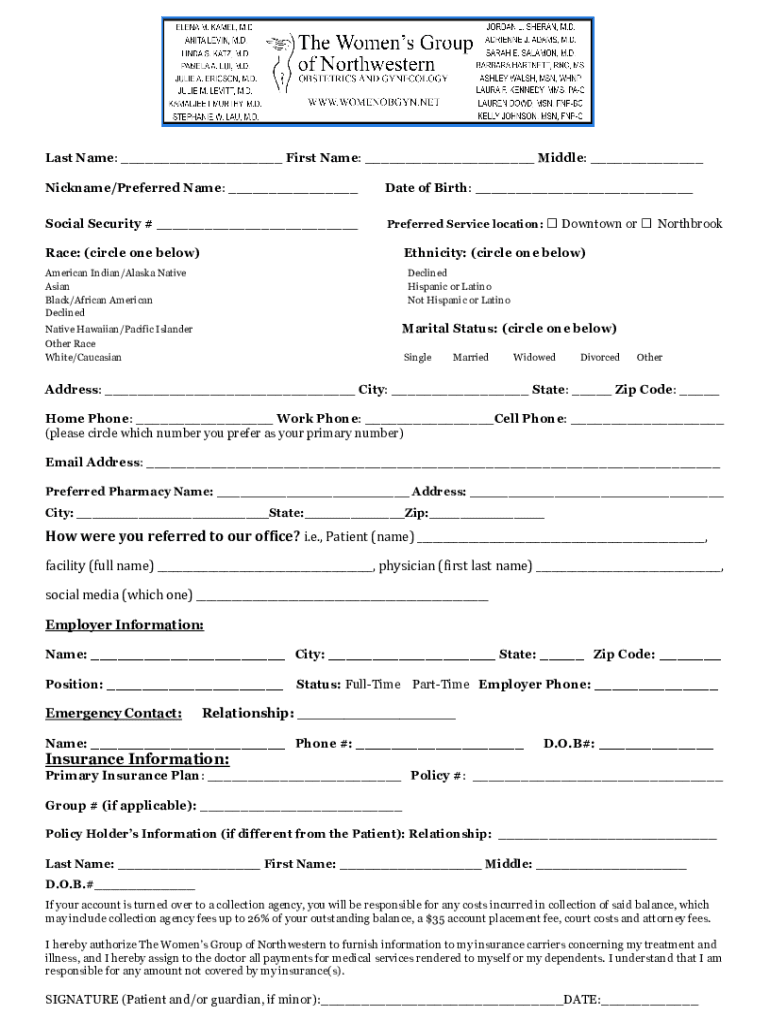 Last Name: First Name: Middle: Nickname/Preferred Name: Date of Birth: Social Security # Preferred Service location:Race: (circle one below) Downtown or NorthbrookEthnicity: (circle one below)American
