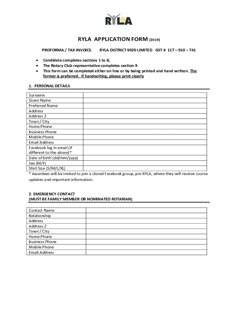 AYLA APPLICATION FORM 2019 PROFORMA / TAX INVOICE. AYLA DISTRICT 9920 LIMITED GST # 117 910 741Candidate completes sections 1 to 8, The Rotary Club representative completes section 9 This form can