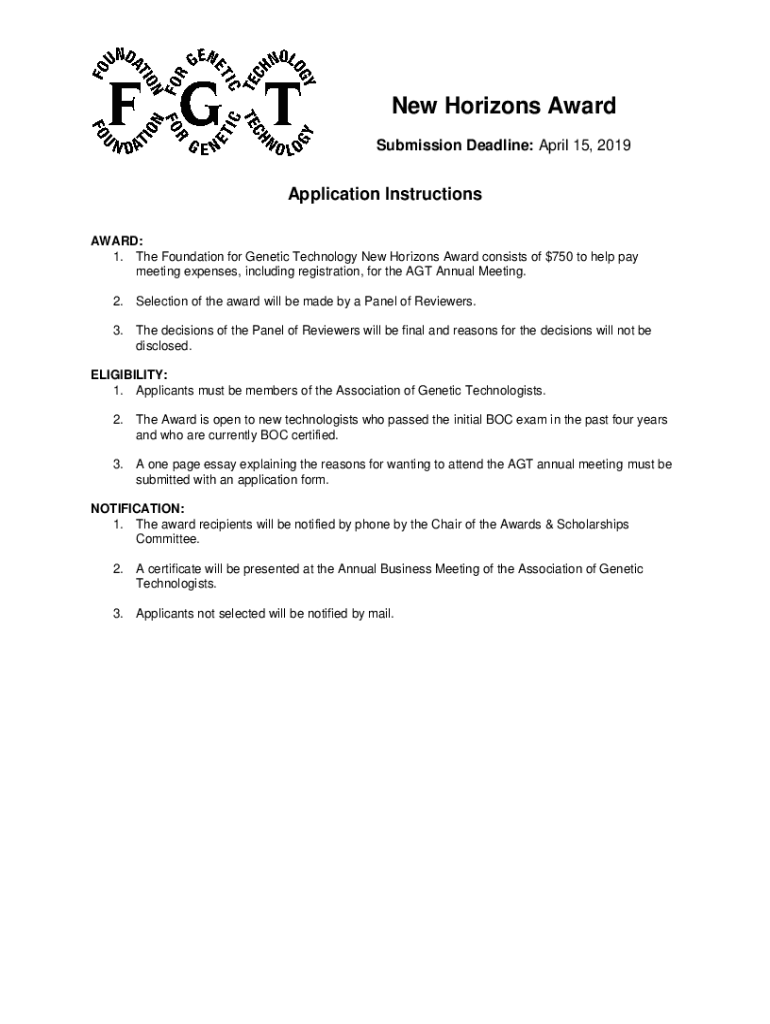 1. The Foundation for Genetic Technology New Horizons Award consists of $750 to help pay