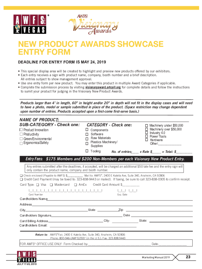 Get the free NEW PRODUCT AWARDS SHOWCASE ENTRY FORM - AWFS Fair