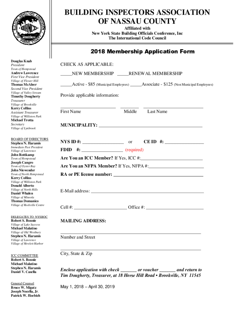 BUILDING INSPECTORS ASSOCIATION OF NASSAU COUNTY Affiliated with New York State Building Officials Conference, Inc The International Code Council2018 Membership Application Form Douglas Knob PresidentCHECK