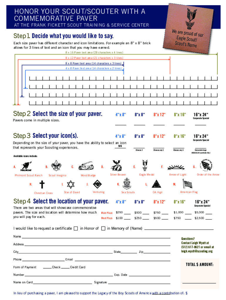 HONOR YOUR SCOUT/SCOUTER WITH A COMMEMORATIVE PAVER AT THE FRANK PICKETT SCOUT TRAINING & SERVICE CENTERStep1. Decide what you would like to say. Each size paver has different character and icon limitations.