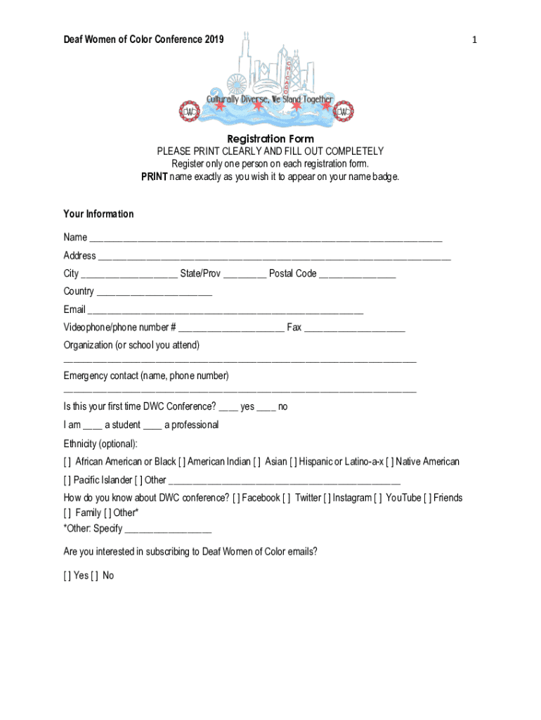 Deaf Women of Color Conference 2019Registration Form PLEASE PRINT CLEARLY AND FILL OUT COMPLETELY Register only one person on each registration form. PRINT name exactly as you wish it to appear on