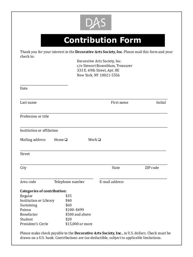 Contribution Form Thank you for your interest in the Decorative Arts Society, Inc. Please mail this form and your check to:Decorative Arts Society, Inc.c/o Stewart Rosenbaum, Treasurer333 E. 69th