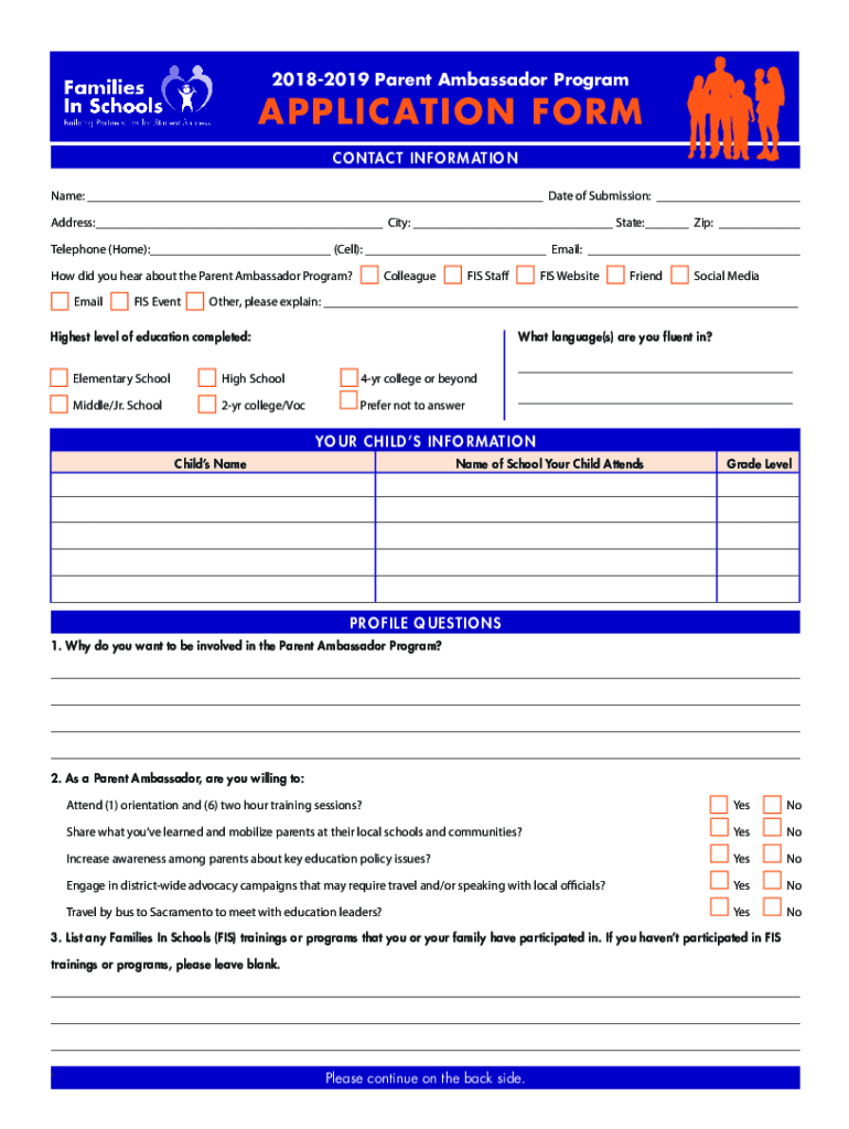 20182019 Parent Ambassador ProgramAPPLICATION FORM CONTACT INFORMATION Name: Date of Submission: Address: City: State: Zip: Telephone (Home): (Cell): Email: How did you hear about the Parent Ambassador