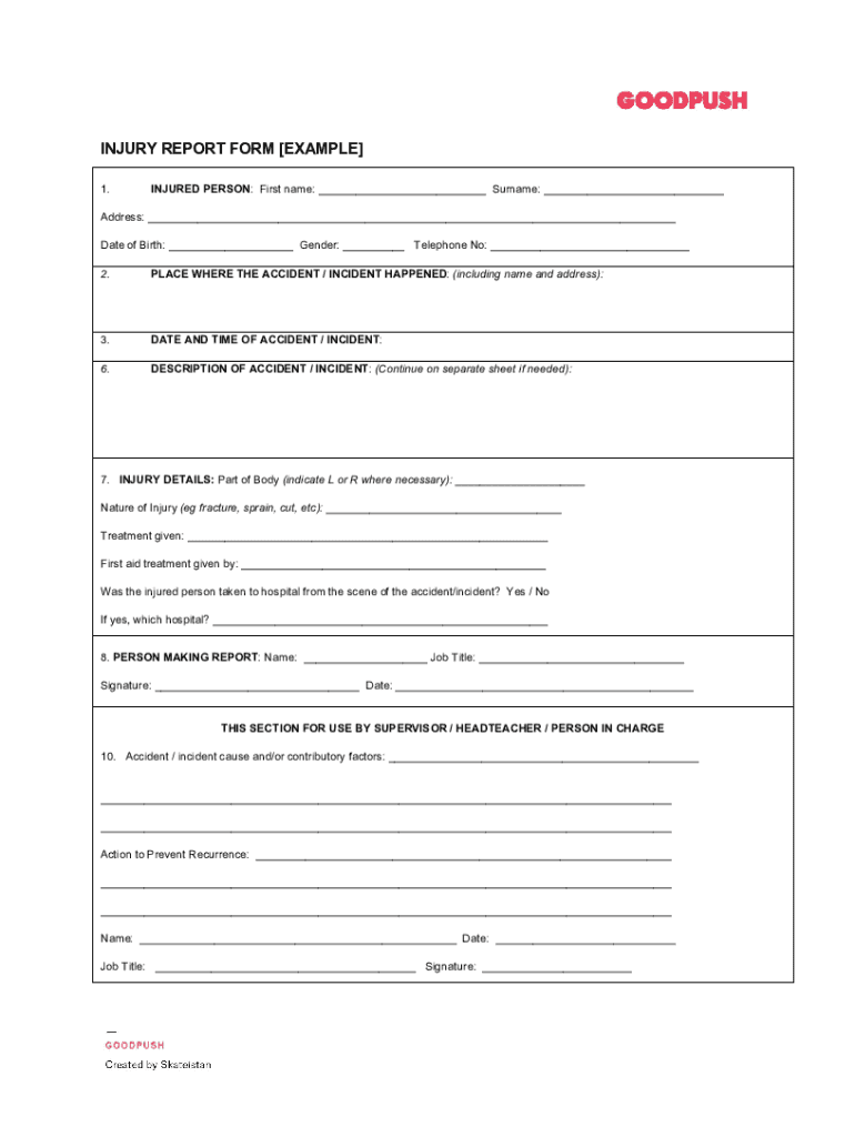 INJURY REPORT FORM EXAMPLE 1.INJURED PERSON: First name: Surname: Address: Date of Birth: Gender: Telephone No: 2.PLACE WHERE THE ACCIDENT / INCIDENT HAPPENED: (including name and address):3.DATE