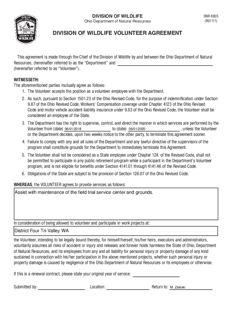 (R01111)Ohio Department of Natural ResourcesDIVISION OF WILDLIFE VOLUNTEER Agreements agreement is made through the Chief of the Division of Wildlife by and between the